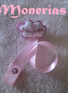 Éstos son un par de modelos de chupeteros que me pidieron hace poco... Son para nena aunque también los estoy haciendo para nene y con más motivos decorativos. Éstos son para ocasiones especiales como por ejemplo un bautizo, boda o comunión... y dependiendo de si son más bebés o un poco más grandotes. Espero que os gusten!